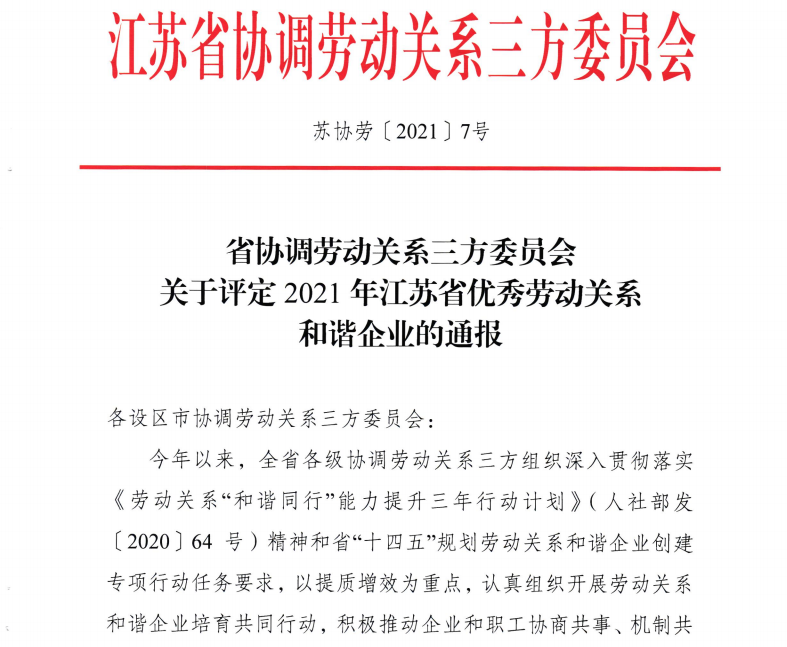 按照《關于開展2021年勞動關系和諧企業培育和評定的通知》(蘇協勞〔2021〕4號)的工作部署,省協調勞動關系三方委員會研究決定,評定江蘇揚子凈化工程有限公司等200家企業為“2021年江蘇省優秀勞動關系和諧企業”。