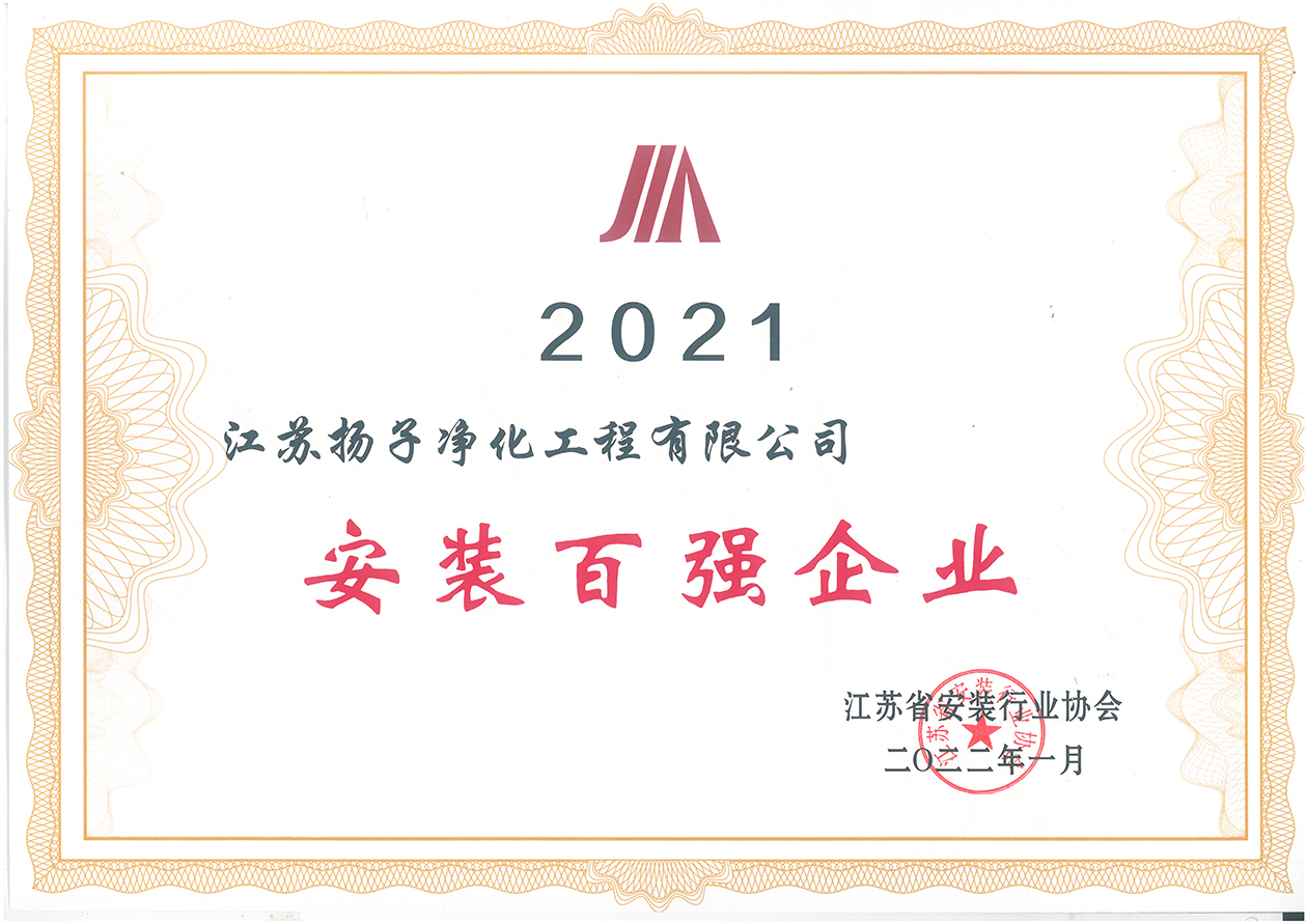 近日,江蘇省安裝行業協會下發了2021年度“安裝百強企業”榮譽證書。此前根據協會公布的2021年度“安裝百強企業”評價標準,江蘇揚子凈化工程有限公司順利通過審核,榮獲此項稱號。