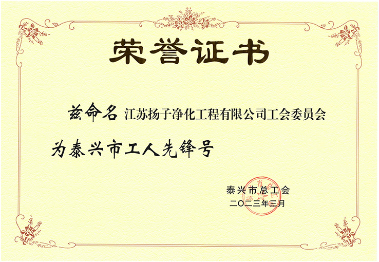 江蘇揚子凈化工程有限公司工會委員會獲泰州市,泰興市“工人先鋒號”榮譽稱號