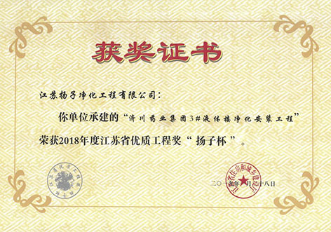 2019年1月28日,江蘇省住房和城鄉建設廳公示了2018年度江蘇省優質工程獎“揚子杯”獲獎項目名單,江蘇揚子凈化工程有限公司承建的“濟川藥業集團3#液體樓凈化安裝工程”,榮獲江蘇省“揚子杯”優質工程獎。
